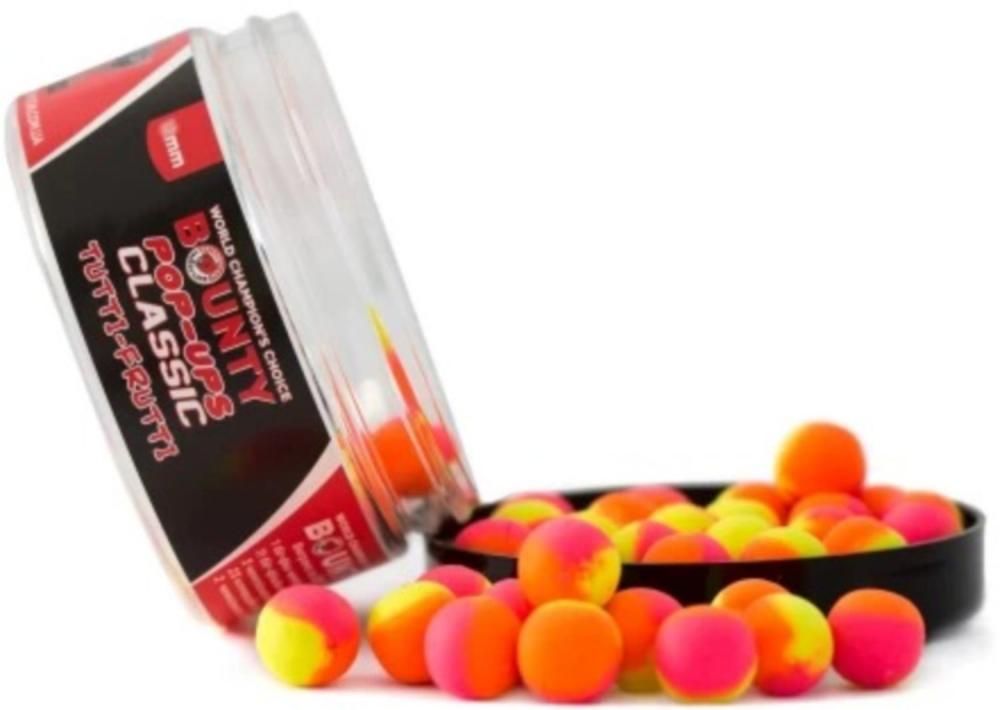 Бойлы Bounty Pop-Up Tutti-Frutti 8 мм 55 шт. — поп-апы круглой формы для насадки, основная задача которых — сделать крючок легче, чтобы он быстрее попадал в рот карпу. Поп-апы от Bounty имеют очень стабильную плавучесть — крючок может держаться в нужном положении несколько дней. Они бывают разных диаметров: 8 мм, 10 мм, 12 мм, 14 мм. Все банки вполне герметичны. Благодаря этому поп-апы хорошо сохраняются, а запаха в авто нет.