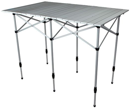 Стол складной алюминиевый. Столешница состоит из пластин алюминиевого профиля с шарнирными соединительными элементами. Столешница сворачивается в компактный рулон. Стол очень удобный при хранении и транспортировке.