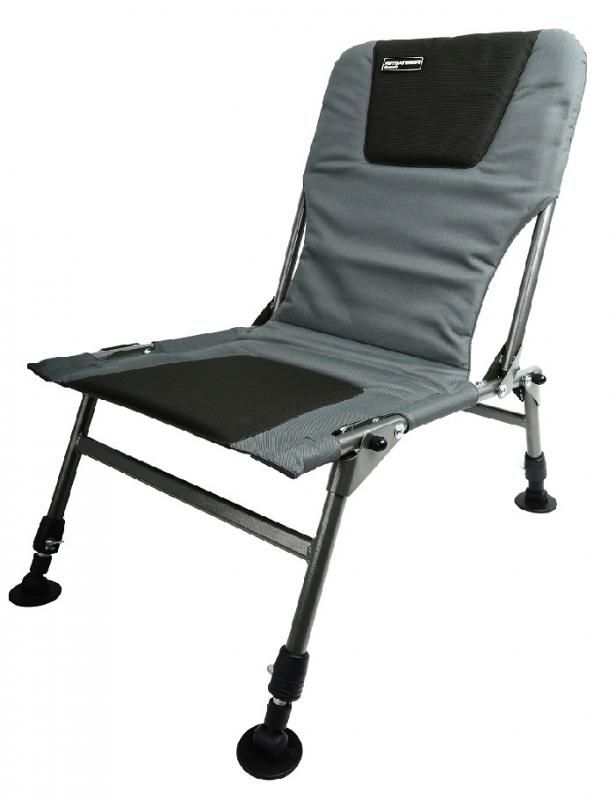 Четыре регулируемые по длине ножки оснащены широкими подвижными пятками. Благодаря чему это кресло можно установить на любой неровной поверхности, а также на мягком грунте. Имеет мощную алюминиевую раму. Прекрасное кресло для рыбалки в ограниченном пространстве. Благо-даря своим конструкционным особенностям, очень легкое и компактное при транспортировке.