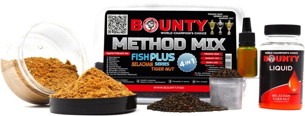 Метод микс Bounty Method Mix Belachan / Tiger Nut 4 в 1 — оптимальный усовершенствованный микс от двукратных чемпионов мира по рыбалке карпа Клуба Кричевичи. В свое время Method Mix 3 в 1 успел стать легендарным среди любителей карпфишингу и не только, поскольку прекрасно ловил. Однако компания постоянно развивается. Поэтому в сезоне 2021 добавили в него кроме Пеллеты, Ликвид и флюро еще активатор клева. Все для того, чтобы вы всегда возвращались из водоемов с трофеями.