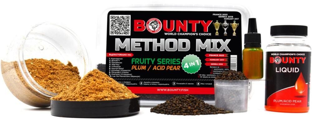 Метод микс Bounty Method Mix Plum / Asid Pear 4 в 1 — оптимальный усовершенствованный микс от двукратных чемпионов мира по рыбалке карпа Клуба Кричевичи. В свое время Method Mix 3 в 1 успел стать легендарным среди любителей карпфишингу и не только, поскольку прекрасно ловил. Однако компания постоянно развивается. Поэтому в сезоне 2021 добавили в него кроме Пеллеты, Ликвид и флюро еще активатор клева. Все для того, чтобы вы всегда возвращались из водоемов с трофеями.