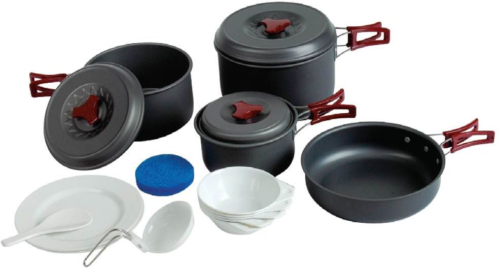 Приобретая набор туристической посуды из анодированного алюминия на 4-5 персон, Вы получаете то, что всегда Вам понадобится во время отдыха на природе или в путешествии. Все предметы наборов очень легкие и компактно складываются друг в друга. Губка для мытья в комплекте позволит Вам без труда содержать посуду в чистоте. Котелки изготовлены из аннодированого алюминия - легкого и прочного материала обладающего высокой теплопроводностью. В посуде из аннодированого алюминия еда готовиться быстрее и лучше, экономя при этом расход топлива. Набор удобно упаковывается в мешочек из синтетической ткани.