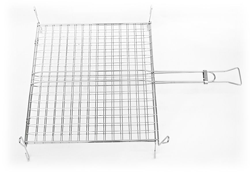 Большая крестообразная двойная сетка-гриль сделанная из высококачественной прочной нержавеющей стали. С двух сторон имеет по две пары ножек. В разложенном положении используется как мангал для шампуров.