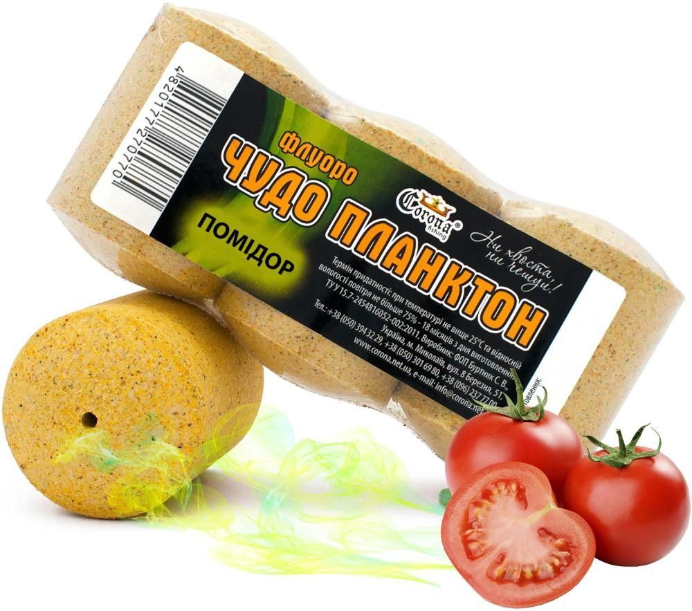 Чудо Планктон Помидор — это технопланктон, который производится по новой, усовершенствованной рецептуре. Бочонки традиционной формы и размера изготавливаются из порошковых компонентов, включающих кормовую основу, пигменты и ароматизаторы. При попадании в воду Чудо Планктон постепенно растворяется, образуя хорошо заметное облако, имитирующее колонию планктона — естественного корма многих видов рыб.
